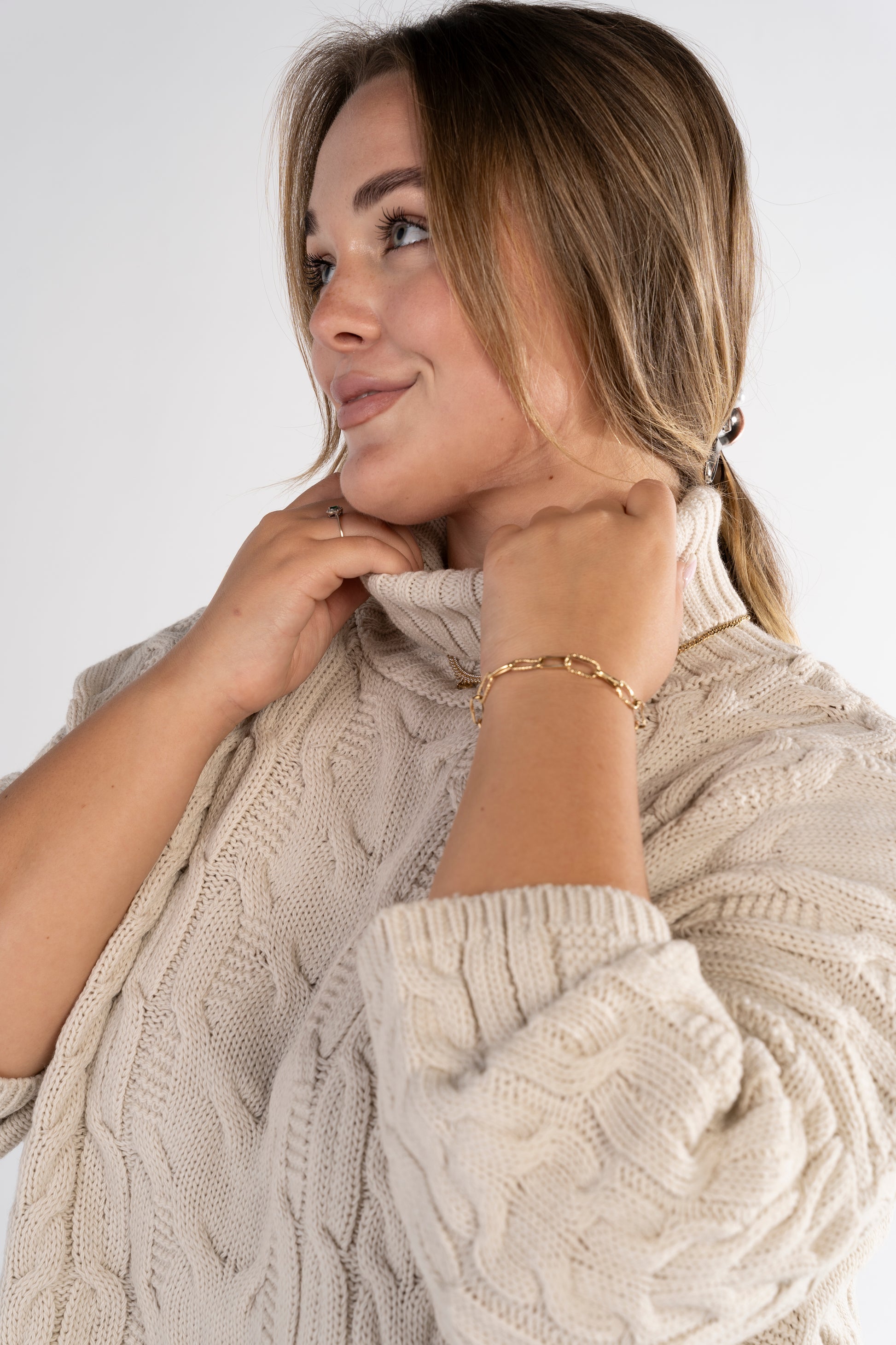 Define your neutral wardrobe with the elegant Heirloom Weave Jumper in "Oatmeal" Crafted with an intricate, chunky cable knit pattern and a stylish high turtleneck, this luxurious jumper offers exceptional warmth and timeless style. Its relaxed, oversized silhouette and stylish side slits provide versatility—wear it effortlessly for a cozy, elegant look, or define your waist with a favorite belt.